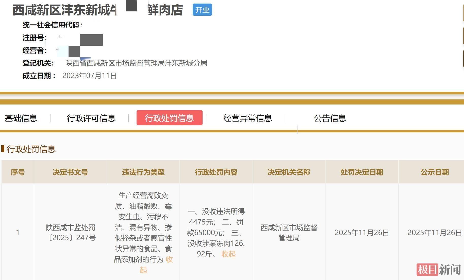 记者获取的西咸新区市场监管局行政惩罚决定书显示,涉事门店为西咸新区沣东新城牛鲜肉店,成立于2023年,代表人是赵某某。